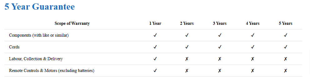 Blinds for Builders offers a five year warranty, to the original purchaser against defects in either materials or workmanship on a return to store basis, The warranty does not cover against misuse, incorrect installation, normal wear and tear or exposure to the elements. any holes or marks in the Blinds must be advised within 5 working day from receipt as they will not appear over time and could only have occcured with fair wear and/or misuse. Metal chains are also considered as above.